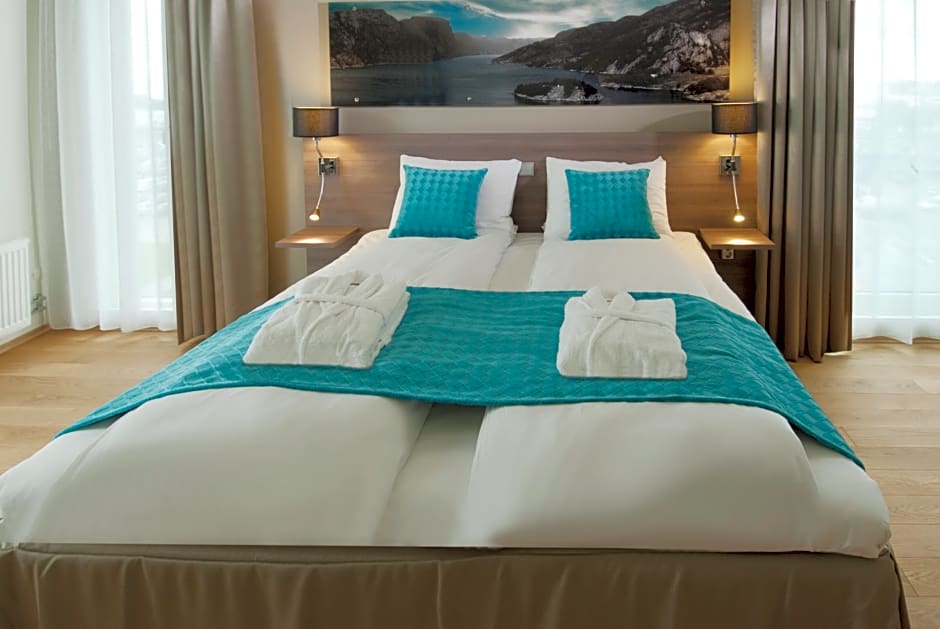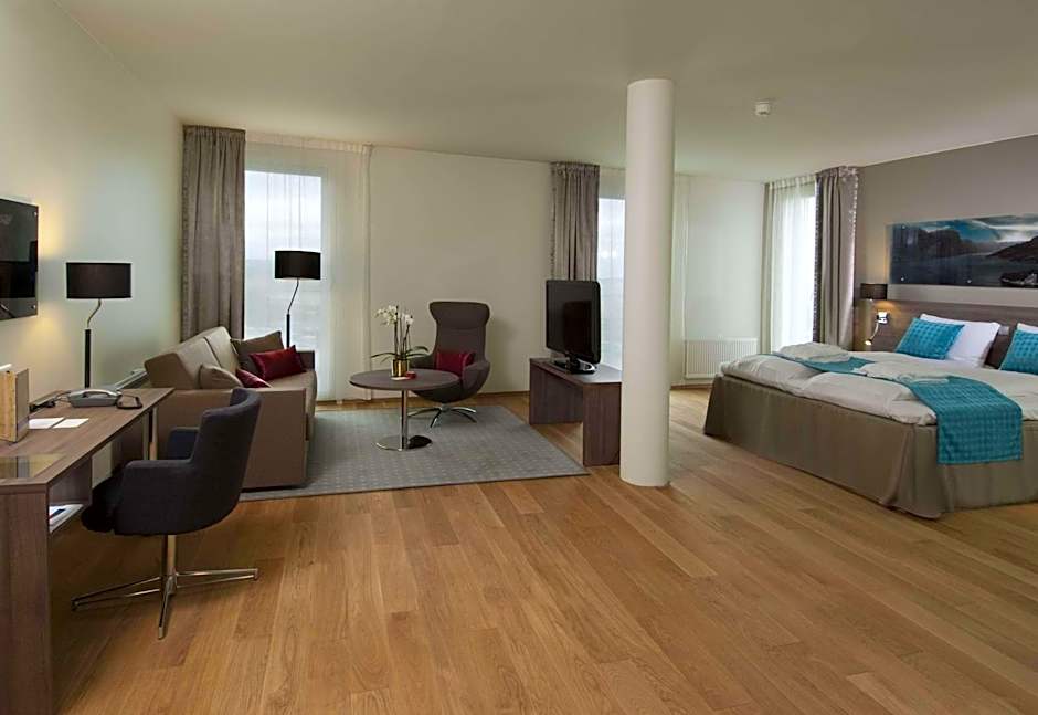 Junior Suite is 431 square feet and includes a queen-size bed 150-154 width plus a sofa bed.